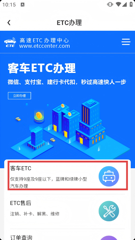 3、在ETC辦理界面,選擇【客車ETC】(支持9座及以下藍牌、綠牌小型汽車辦理),進入辦理流程。