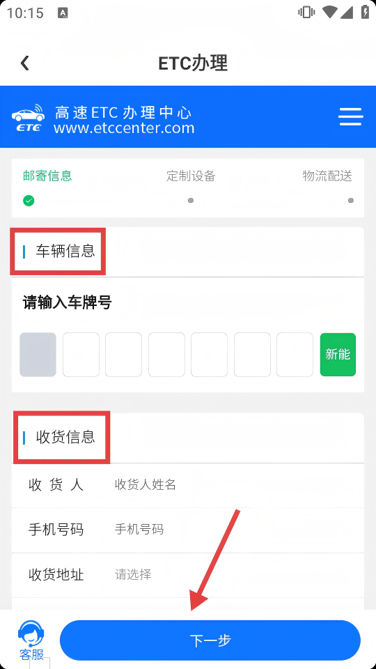4、填寫【車輛信息】和【收貨信息】,然后點擊【下一步】,推進辦理。