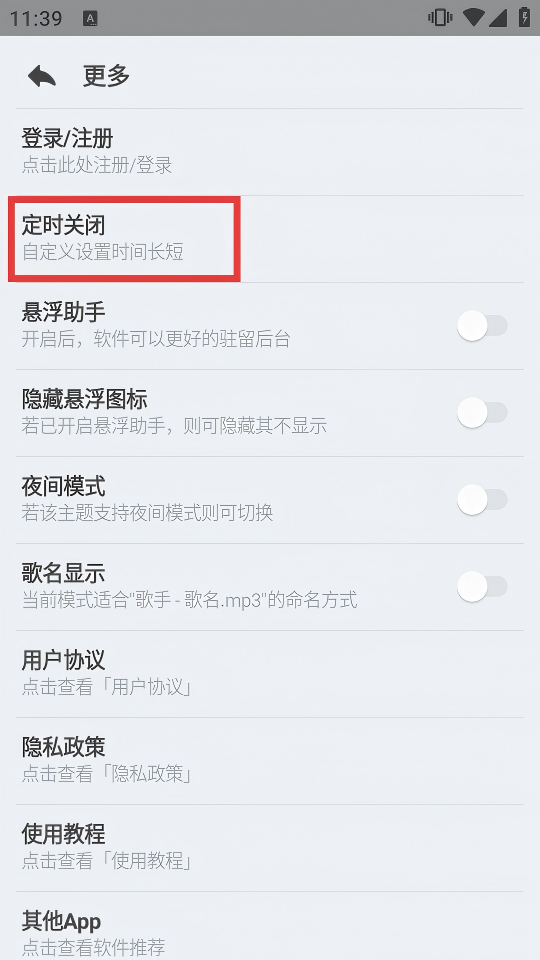 2、在“更多”頁面,點(diǎn)擊【定時(shí)關(guān)閉】選項(xiàng)。