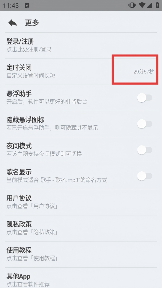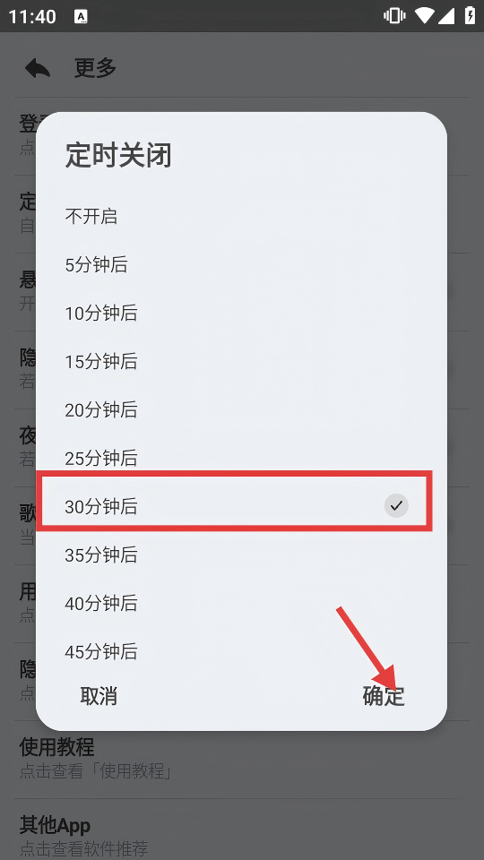 4、設(shè)置后,“定時(shí)關(guān)閉”旁會顯示倒計(jì)時(shí),APP將按時(shí)自動關(guān)閉。