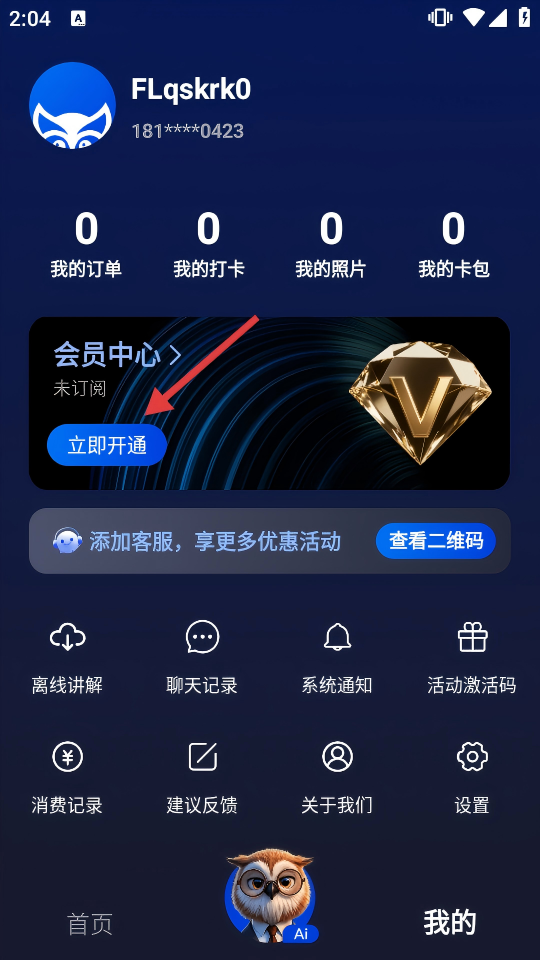 2、在個人頁面,點擊【會員中心】的【立即開通】,進(jìn)入會員中心頁面。