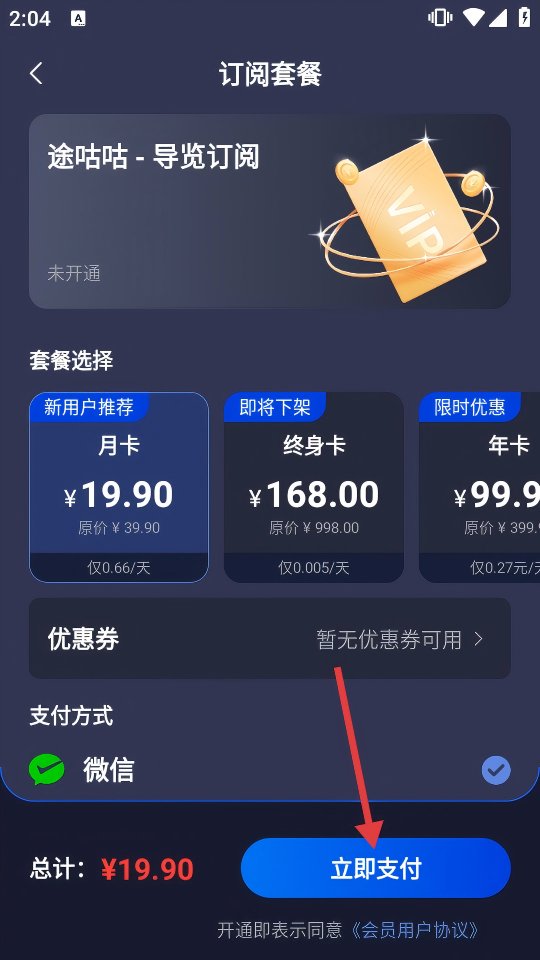 4、在訂閱套餐頁面,選擇套餐,選好支付方式(如微信)后,點擊【立即支付】,完成會員開通。