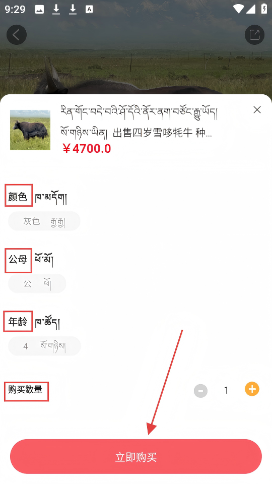 4、在商品詳情頁(yè),確認(rèn)【顏色】【公母】【年齡】【購(gòu)買(mǎi)數(shù)量】等信息后,點(diǎn)擊【立即購(gòu)買(mǎi)】按鈕。