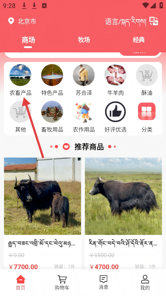 1、在首頁(yè),點(diǎn)擊【農(nóng)畜產(chǎn)品】分類圖標(biāo),進(jìn)入農(nóng)畜產(chǎn)品頁(yè)面。
