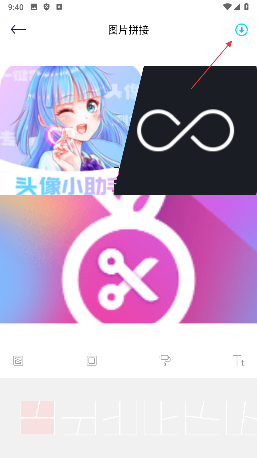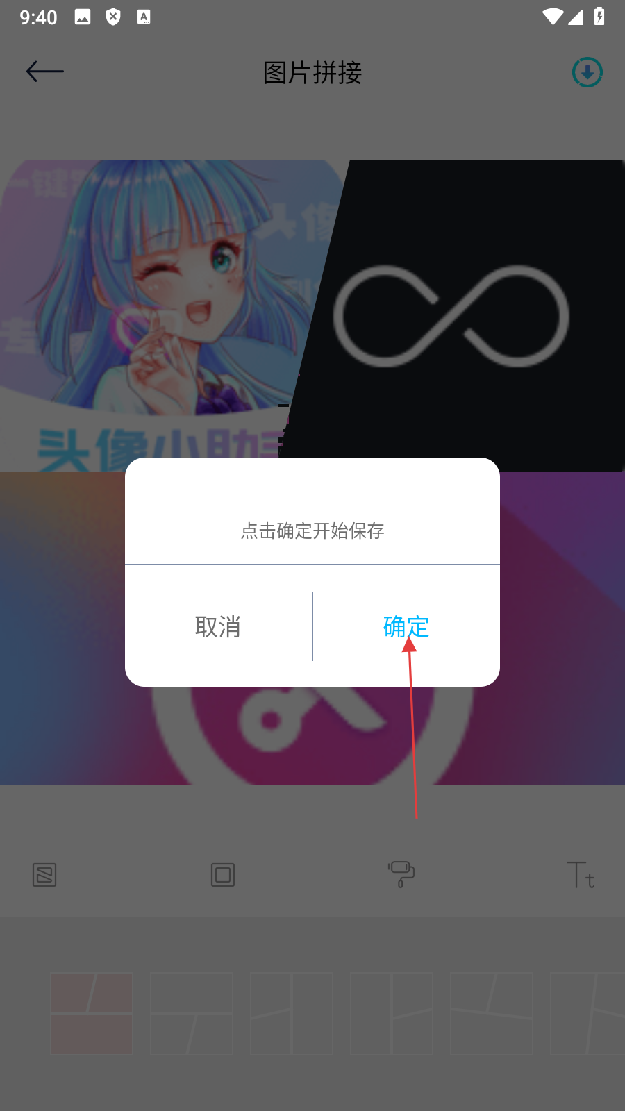 3、在圖片拼接頁面編輯完成后,點(diǎn)擊【右上角下載圖標(biāo)】,彈出保存確認(rèn)彈窗。