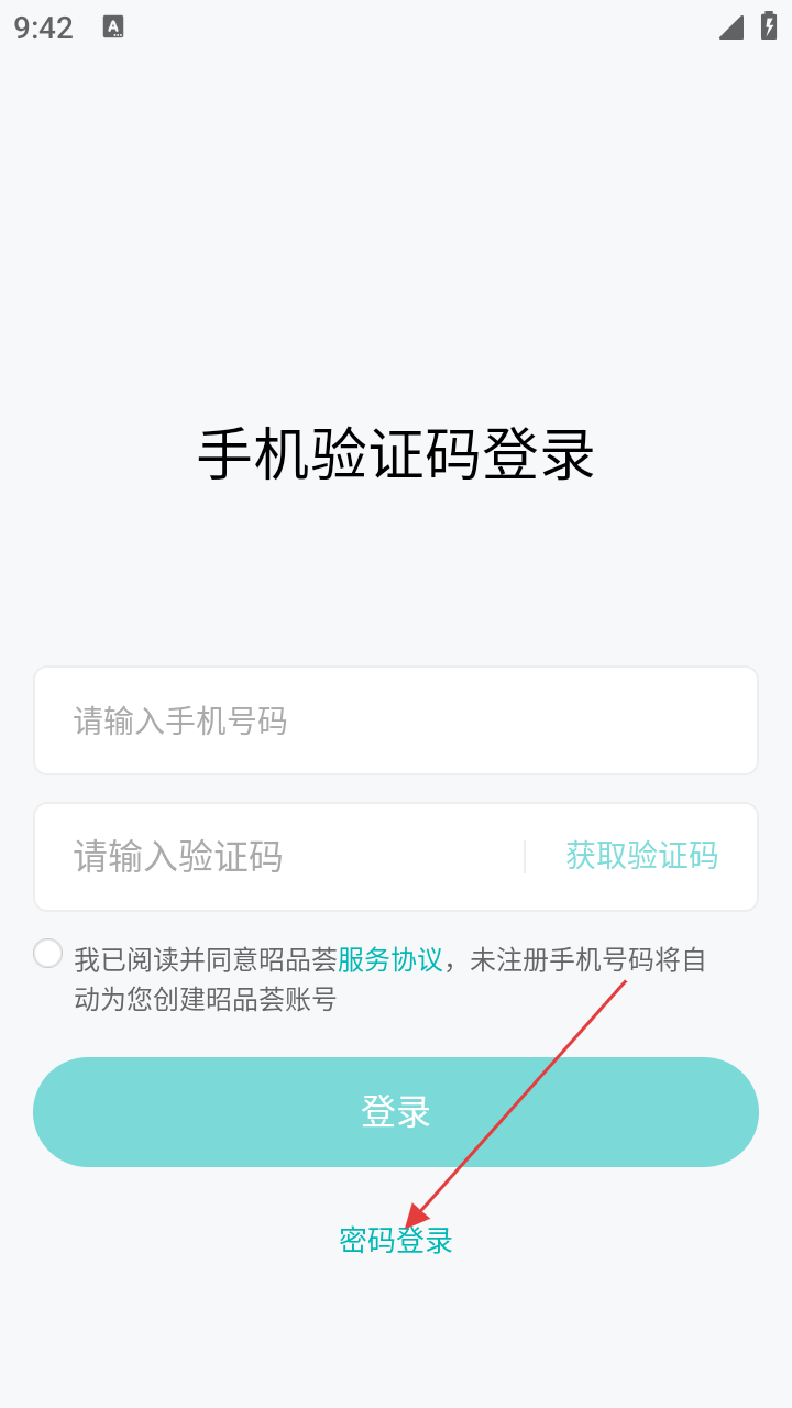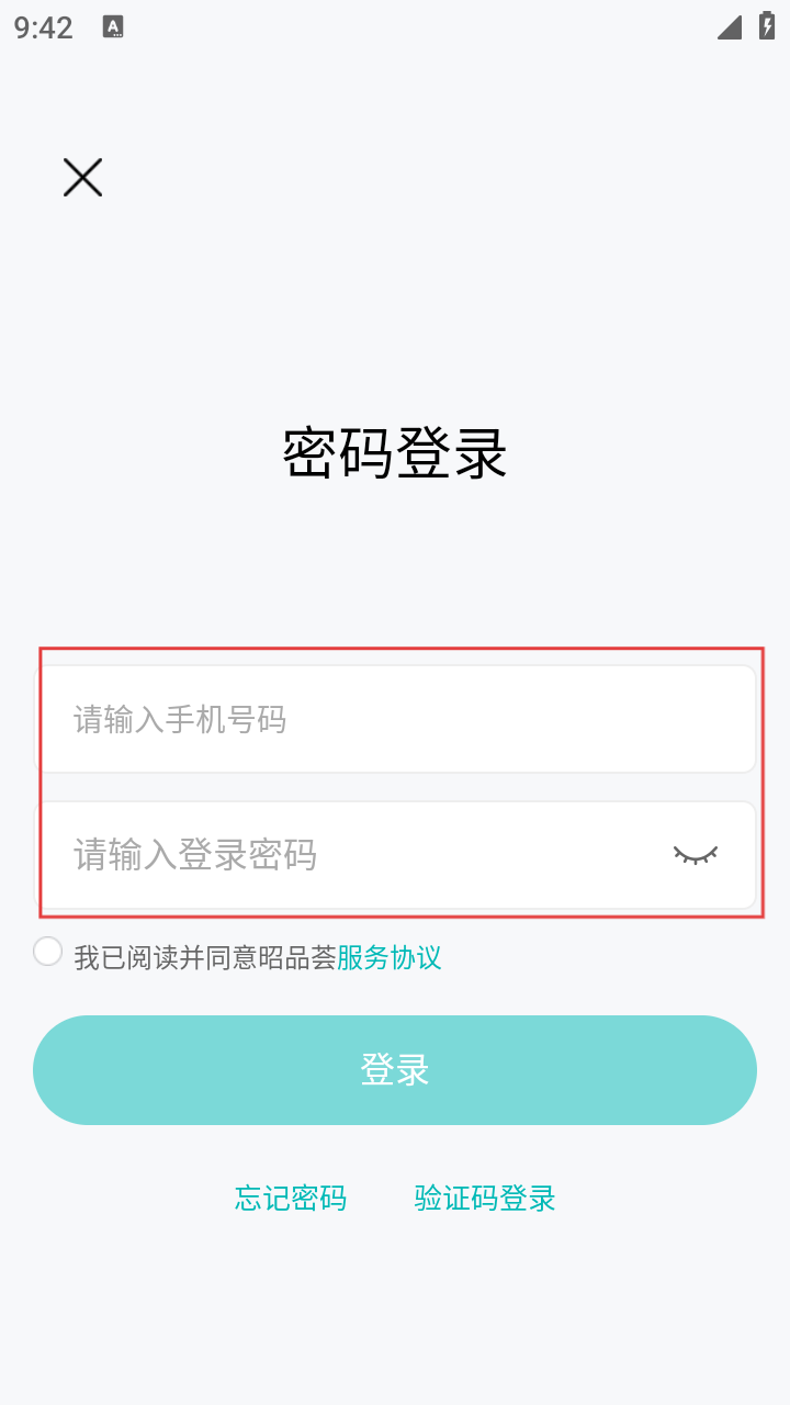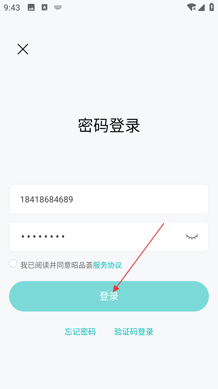 4、在【密碼登錄】頁面,輸入好手機號和密碼后,點擊藍色【登錄】按鈕,即可嘗試登錄昭品薈。