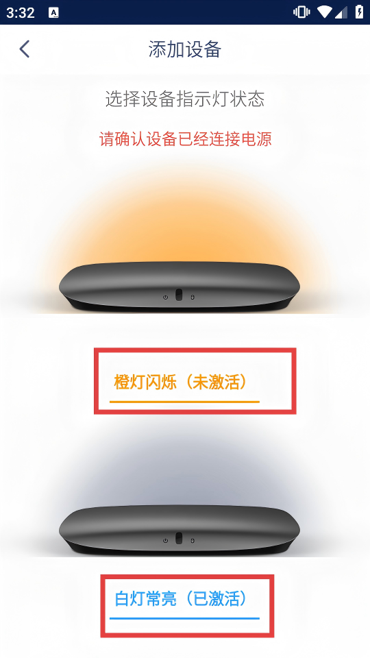 4、在“添加設(shè)備”頁面,根據(jù)設(shè)備實(shí)際指示燈狀態(tài),繼續(xù)完成設(shè)備連接。