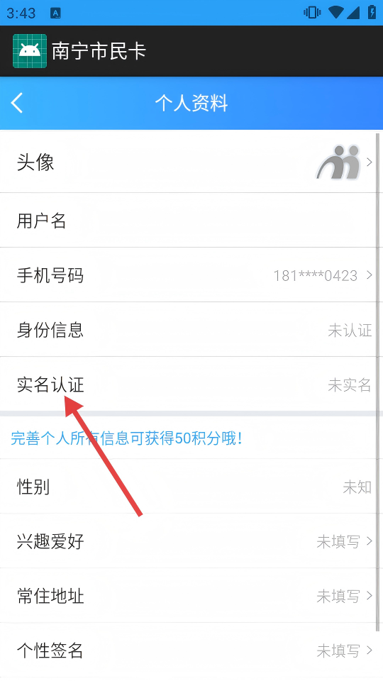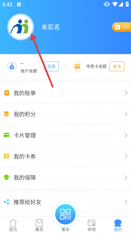 1、打開南寧市民卡APP,點(diǎn)擊“我的”頁面上方頭像區(qū)域,進(jìn)入個(gè)人資料頁面。