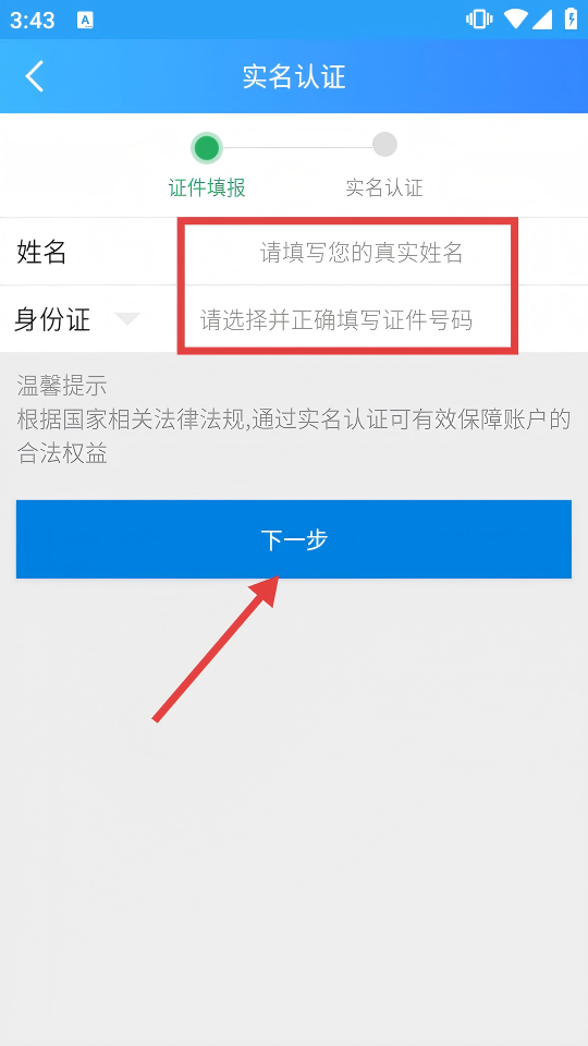 3、在“證件填報(bào)”步驟,填寫真實(shí)姓名和身份證號碼,然后點(diǎn)擊【下一步】。
