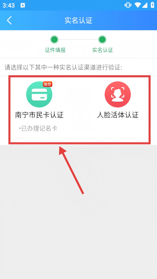 4、在“實(shí)名認(rèn)證”步驟,選擇“南寧市民卡認(rèn)證”或“人臉活體認(rèn)證”其中一種渠道,完成身份驗(yàn)證。