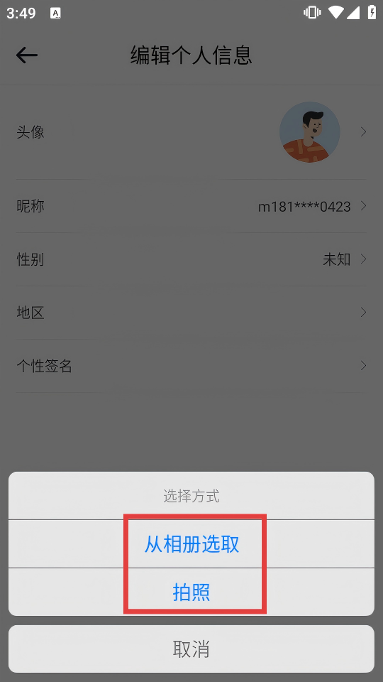 4、在選擇方式彈窗中,選“從相冊選取”或“拍照”,就能更換個(gè)人頭像。