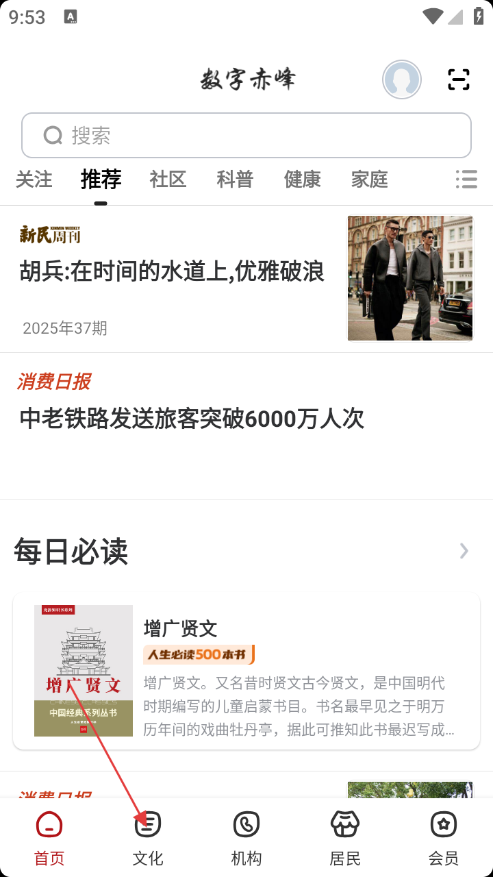 1、進(jìn)入【數(shù)字赤峰】首頁(yè),能看到推薦內(nèi)容和【每日必讀】板塊,若想了解文化相關(guān),點(diǎn)擊底部【文化】選項(xiàng)。