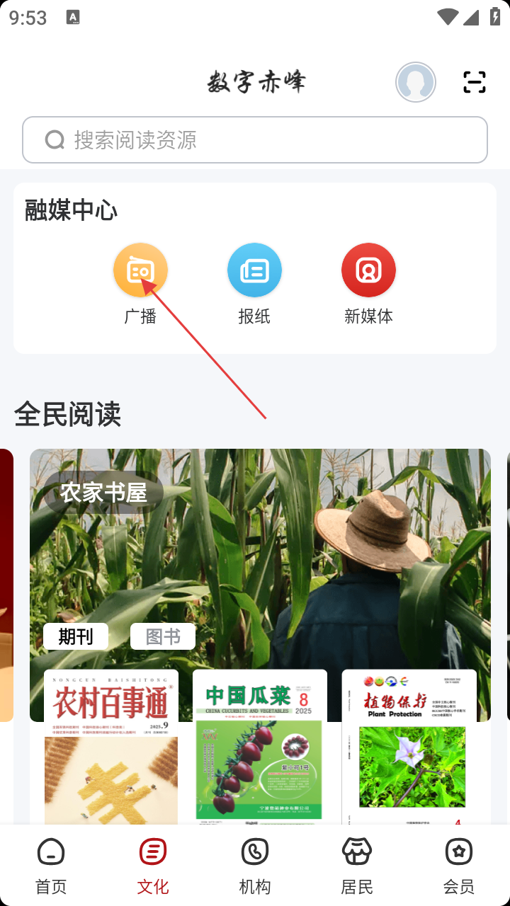 2、在【文化】頁(yè)面,有【融媒中心】和【全民閱讀】板塊,若想聽廣播,點(diǎn)擊【融媒中心】下的【廣播】選項(xiàng)。