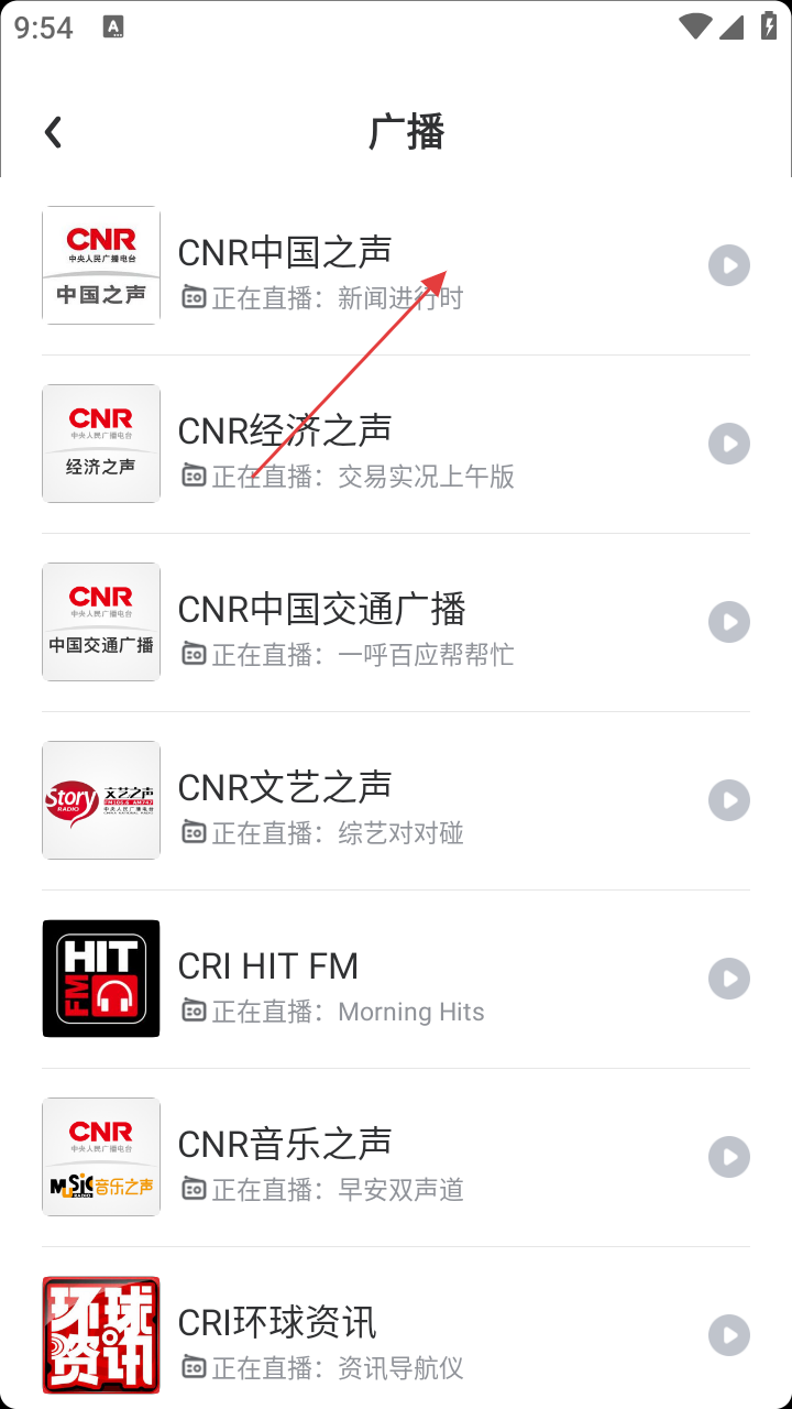 3、進(jìn)入【廣播】頁(yè)面,可看到多個(gè)廣播頻道,如【CNR中國(guó)之聲】【CNR經(jīng)濟(jì)之聲】等,選擇想聽的頻道點(diǎn)擊播放。