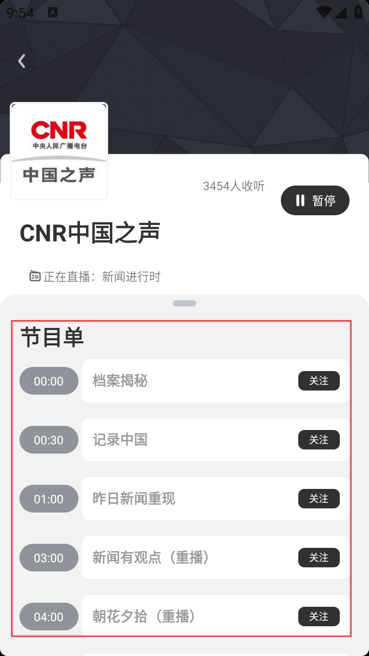 4、點(diǎn)擊【CNR中國(guó)之聲】后,進(jìn)入播放頁(yè)面,能看到收聽人數(shù)、暫停按鈕,還有【節(jié)目單】,可查看不同時(shí)段節(jié)目并關(guān)注。