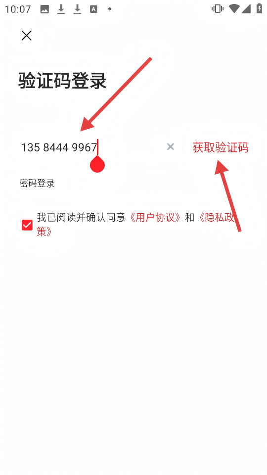 3、選擇【驗證碼登錄】,輸入手機(jī)號,點擊【獲取驗證碼】。