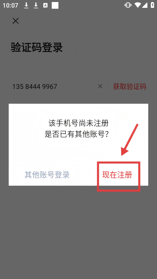 4、若手機(jī)號未注冊,在彈出的提示框中點擊【現(xiàn)在注冊】,即可完成注冊流程。