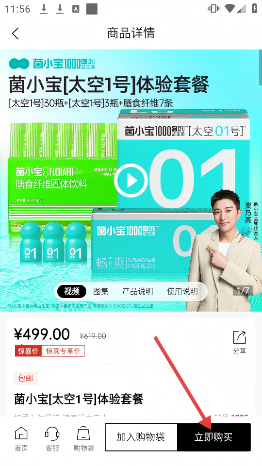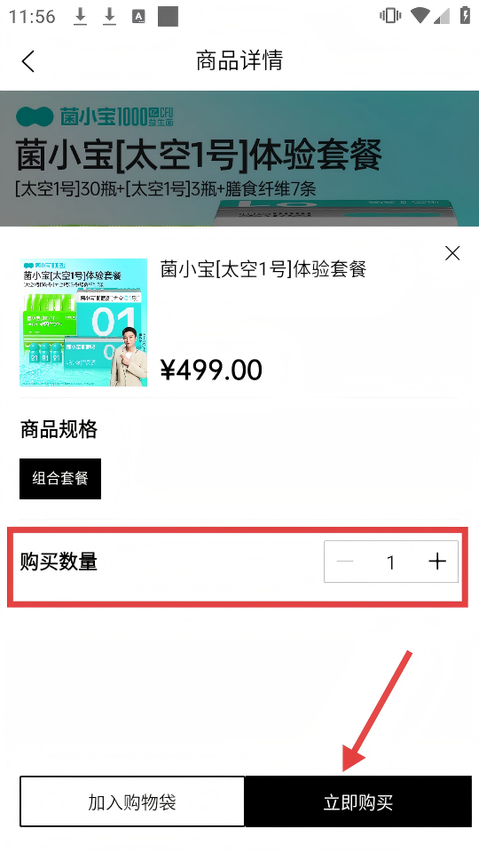 3、進(jìn)入【菌小寶[太空1號(hào)]體驗(yàn)套餐】商品詳情頁(yè)后,可點(diǎn)擊【立即購(gòu)買(mǎi)】按鈕推進(jìn)購(gòu)買(mǎi)流程。