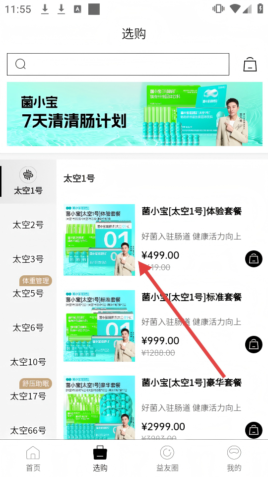 2、在【選購(gòu)】頁(yè)面,能瀏覽【菌小寶-7天清清腸計(jì)劃】等活動(dòng),還可選擇“太空1號(hào)”類(lèi)商品。