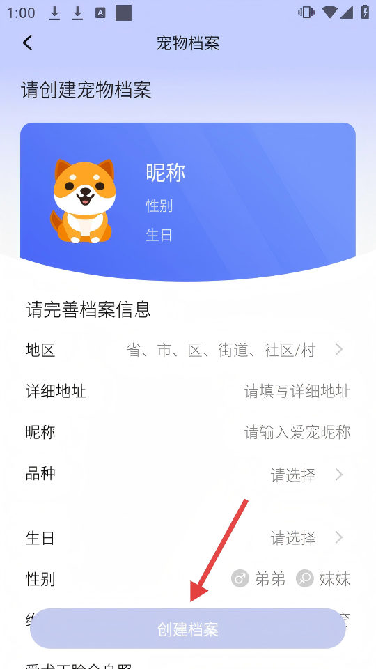 4、在【寵物檔案】頁面,需完善相關(guān)信息,填好后點擊【創(chuàng)建檔案】即可。