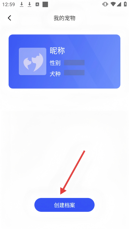 3、進入【我的寵物】頁面,看到藍色卡片顯示寵物信息區(qū)域,點擊下方【創(chuàng)建檔案】按鈕。