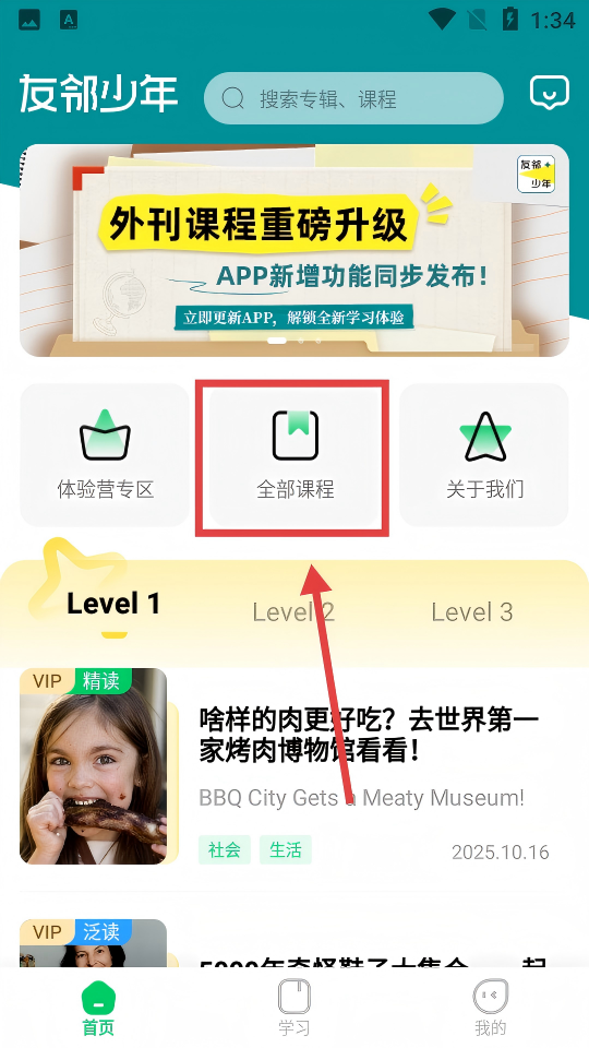 1、打開【友鄰少年】APP,點(diǎn)擊【全部課程】可查看所有課程。