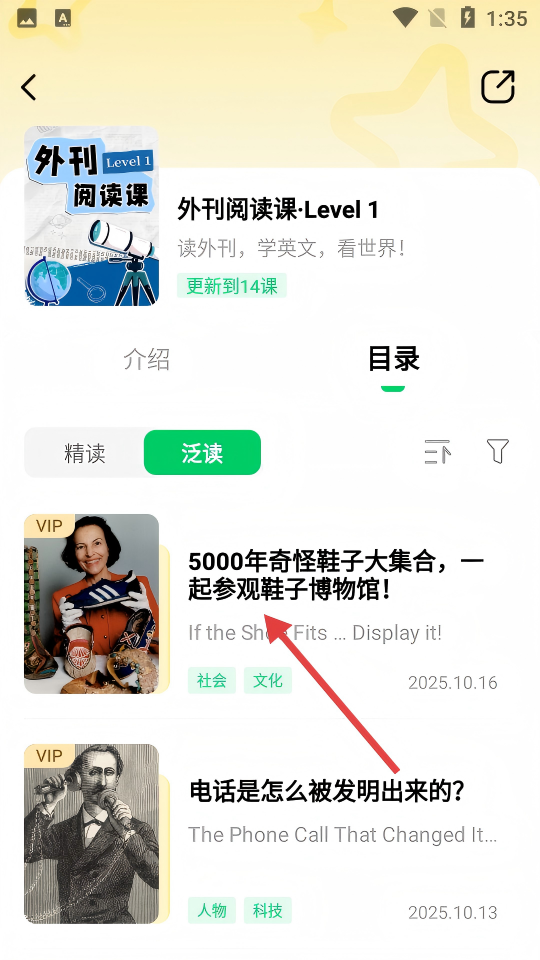 3、在【外刊閱讀課-Level1】頁面,切換到【目錄】-【泛讀】,選擇感興趣的文章。
