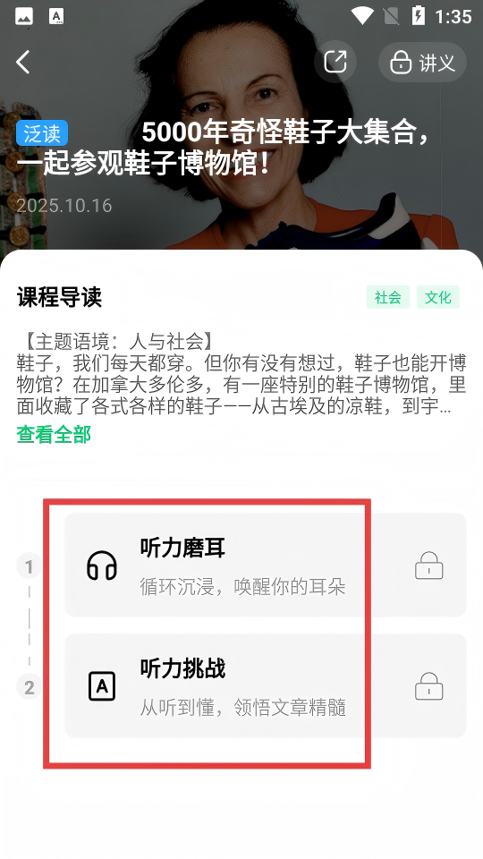 4、進(jìn)入文章詳情頁,可查看【課程導(dǎo)讀】,還能參與【聽力磨耳】【聽力挑戰(zhàn)】等模塊,提升英語聽力與閱讀能力。