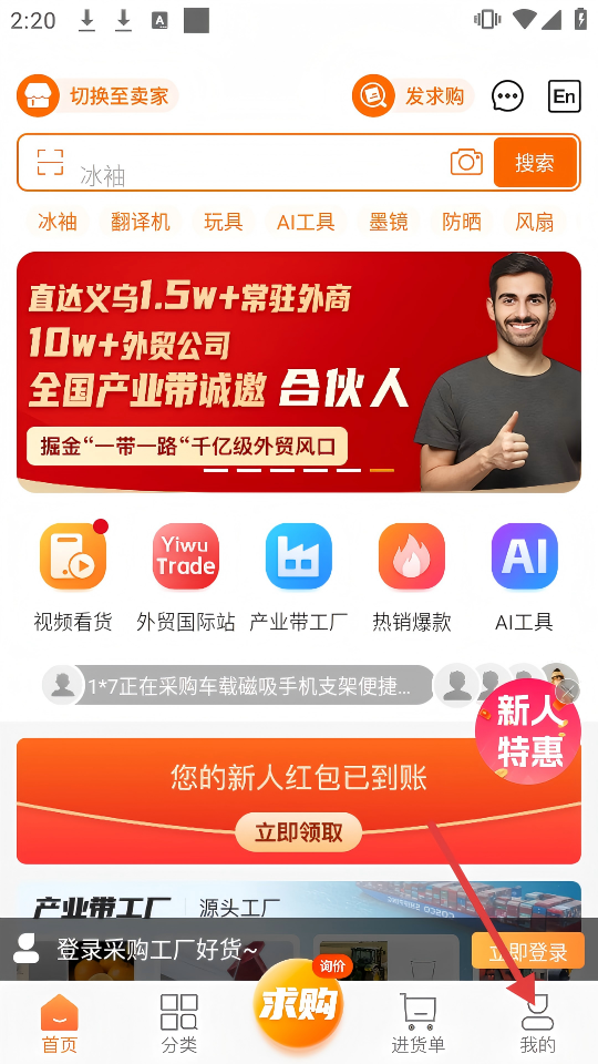 1、打開【義采寶】APP首頁,有【視頻看貨】【外貿(mào)國際站】等功能,想注冊賬號就點(diǎn)擊底部【我的】進(jìn)入個人頁。