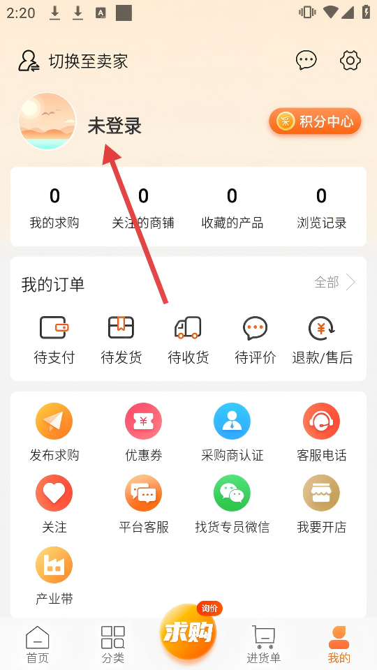 2、在【我的】頁面,能看到【我的求購】【關(guān)注的商鋪】等模塊,點(diǎn)擊【未登錄】進(jìn)入登錄注冊界面。