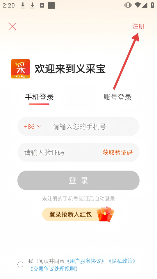 3、進(jìn)入登錄注冊界面,有【手機(jī)登錄】【賬號登錄】選項(xiàng),點(diǎn)擊右上角【注冊】進(jìn)入注冊賬號頁面。