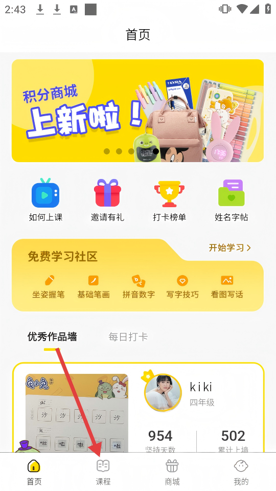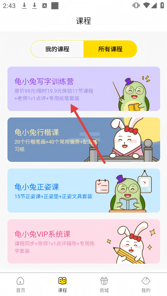 2、在課程頁(yè)面,能看到【我的課程】【所有課程】標(biāo)簽,選擇【龜小兔寫字訓(xùn)練營(yíng)】進(jìn)入課程詳情頁(yè)。