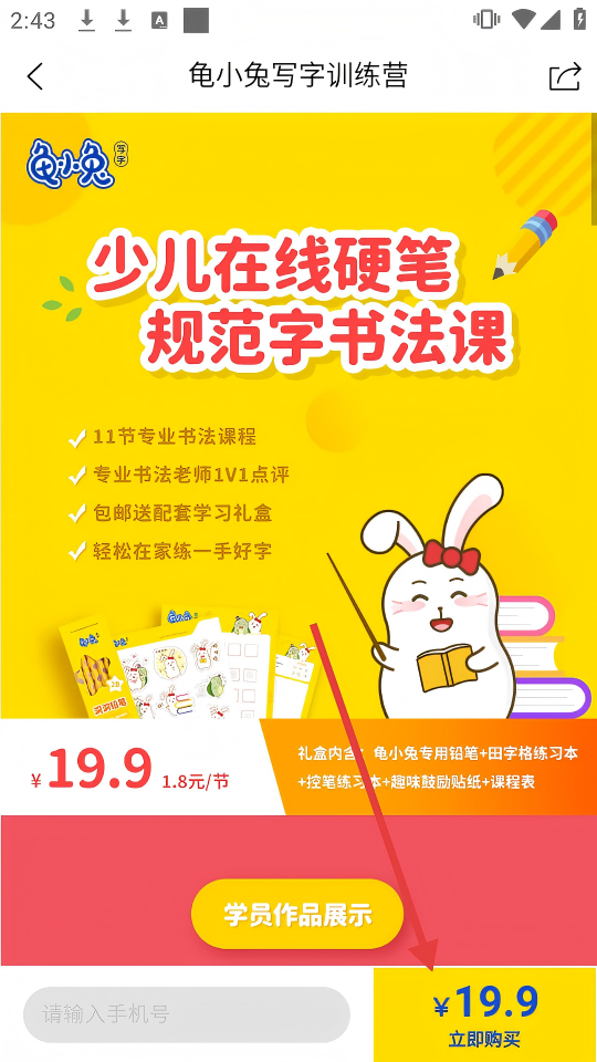 3、進(jìn)入【龜小兔寫字訓(xùn)練營(yíng)】詳情頁(yè),可查看【少兒在線硬筆規(guī)范字書法課】的課程內(nèi)容、價(jià)格,點(diǎn)擊【¥19.9立即購(gòu)買】可下單。