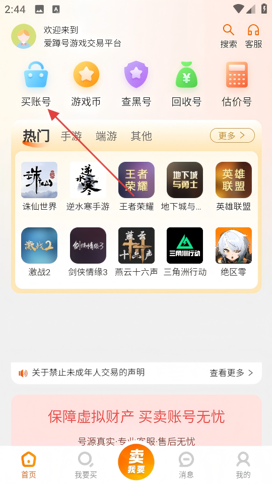 1、在首頁點(diǎn)擊【買賬號】,進(jìn)入“我要買”頁面。