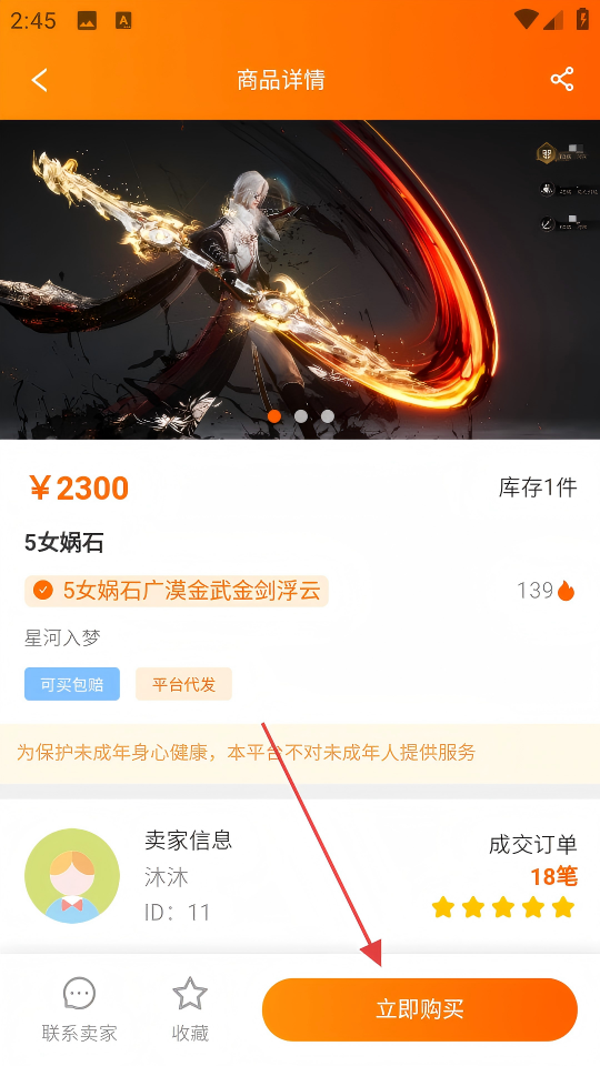4、在商品詳情頁面點(diǎn)擊【立即購買】,完成游戲賬號的購買操作。