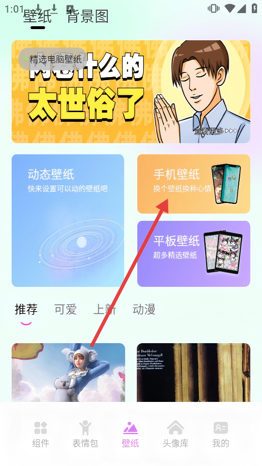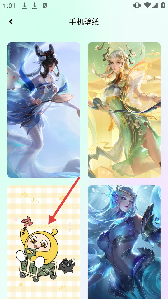 3、進(jìn)入【手機(jī)壁紙】界面后,可選擇帶有卡通形象的壁紙,點擊進(jìn)入詳情頁。