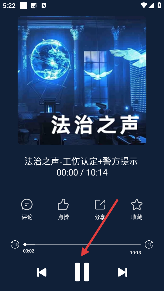 4、在播放頁面,可對(duì)【法治之聲-工傷認(rèn)定+警方提示】音頻進(jìn)行播放、暫停、評(píng)論、點(diǎn)贊、分享、收藏等操作。