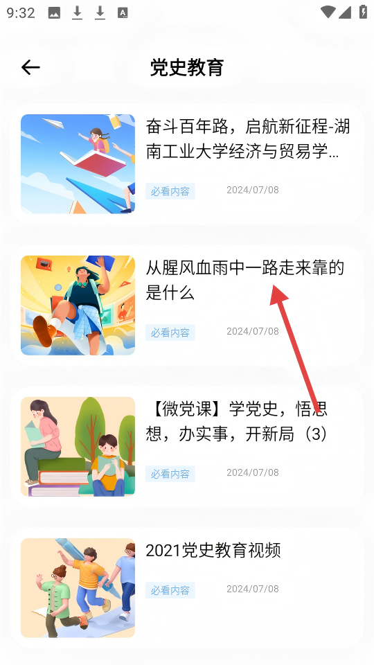 3、在【黨史教育】頁(yè)面,點(diǎn)擊【從腥風(fēng)血雨中一路走來(lái)靠的是什么】?jī)?nèi)容,進(jìn)入該內(nèi)容詳情頁(yè)。