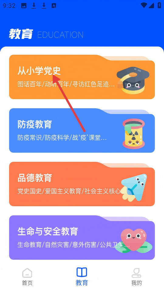 2、在【教育】頁(yè)面,點(diǎn)擊【從小學(xué)黨史】選項(xiàng),進(jìn)入黨史教育相關(guān)頁(yè)面。