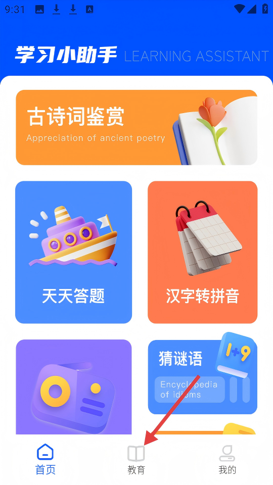 1、在【學(xué)習(xí)小助手】首頁(yè),點(diǎn)擊底部【教育】按鈕,進(jìn)入教育頁(yè)面。