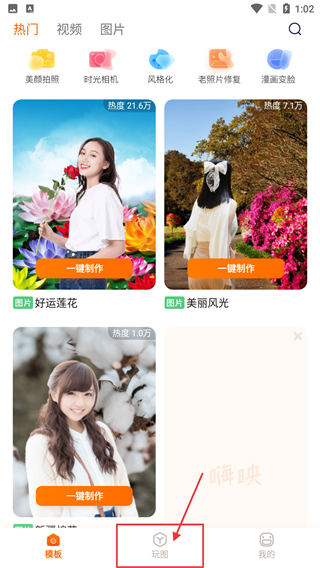 1、進(jìn)入軟件后,點(diǎn)擊底部中間模版可進(jìn)入功能頁面。