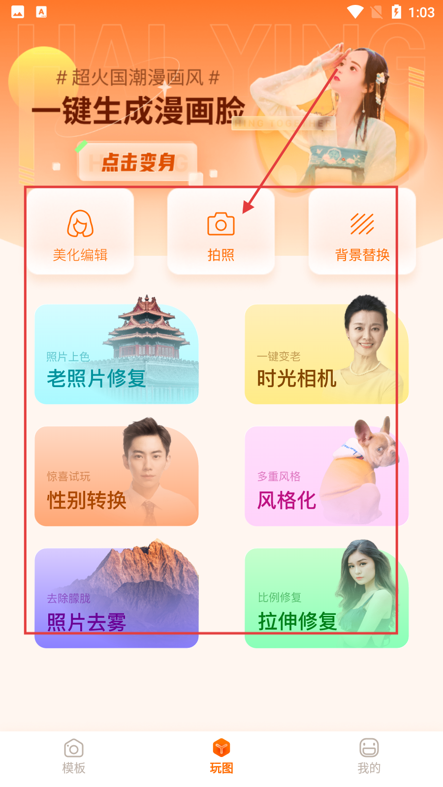 2、看到【美化編輯】【拍照】【背景替換】等功能,還有【老照片修復(fù)】【時(shí)光相機(jī)】等特色功能可選。