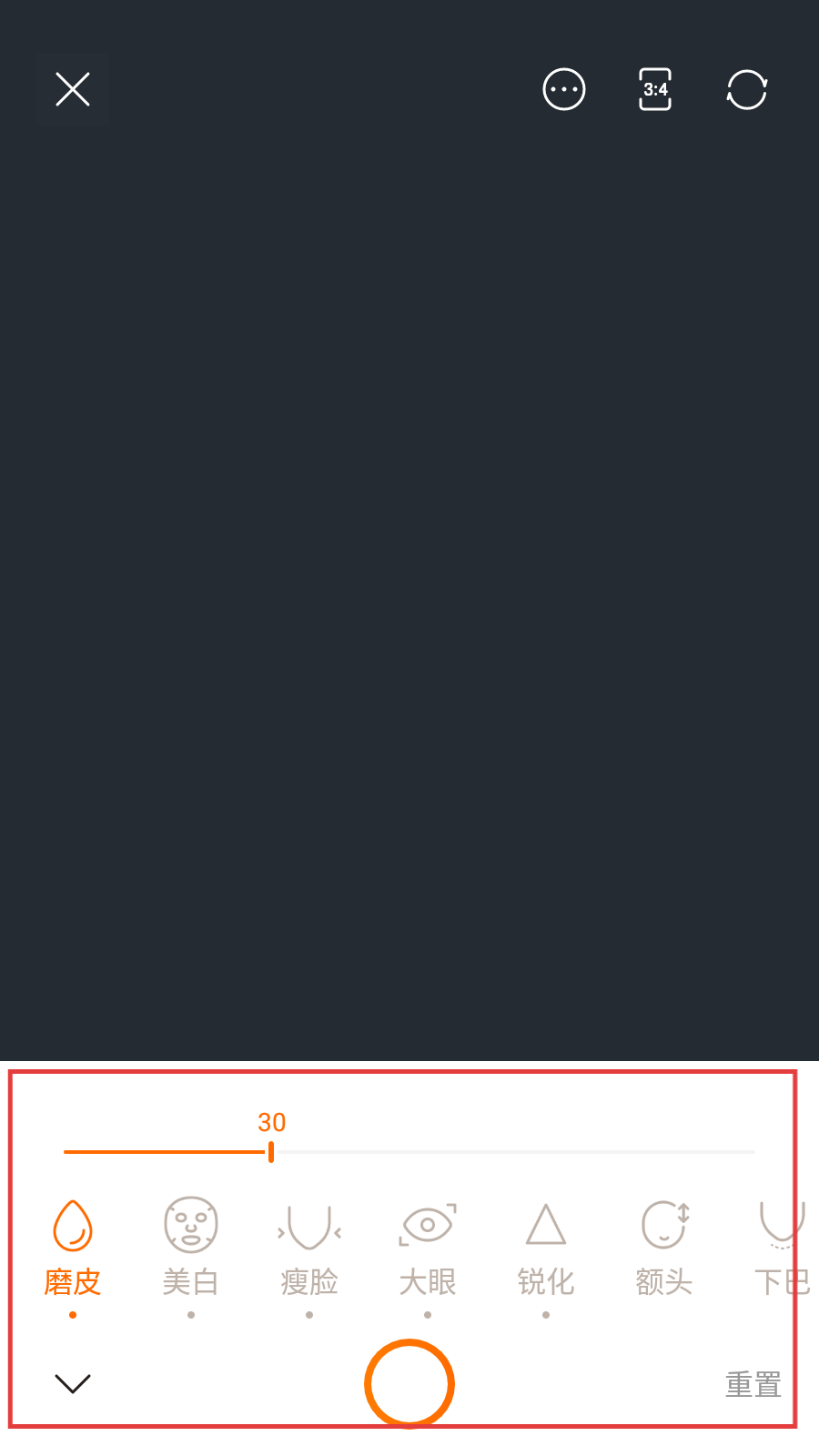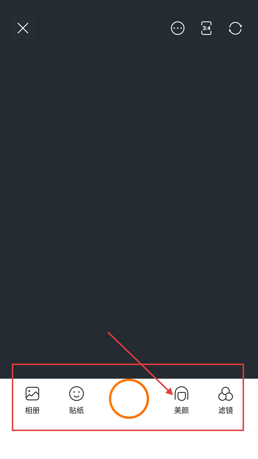 3、進(jìn)入拍攝或編輯界面,底部有【相冊(cè)】【貼紙】【美顏】【濾鏡】等功能,點(diǎn)擊【美顏】可進(jìn)入美顏調(diào)整頁面。