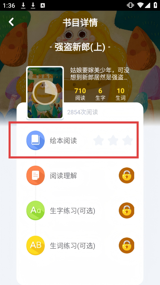3、在【強(qiáng)盜新郎(上)】書目詳情頁(yè),選擇【繪本閱讀】選項(xiàng),即可開始繪本形式的閱讀。