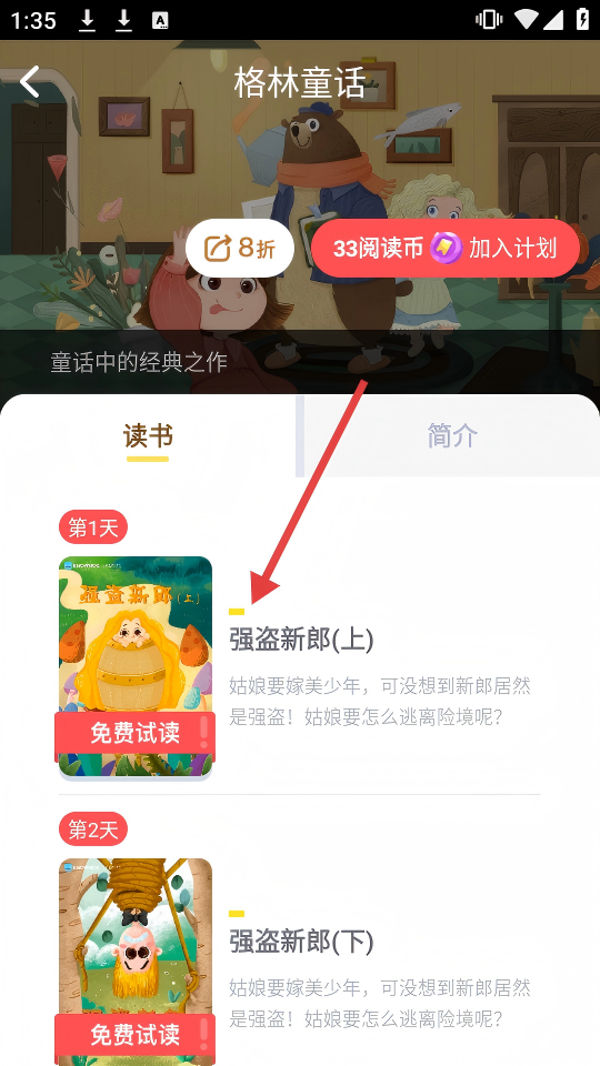 2、進(jìn)入【格林童話】閱讀計(jì)劃,點(diǎn)擊“強(qiáng)盜新郎(上)”章節(jié),可進(jìn)入該書目詳情頁(yè)面。