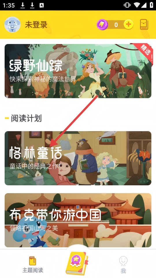 1、進(jìn)入閱讀軟件,在【主題閱讀】頁(yè)面,選擇【格林童話】閱讀計(jì)劃,開啟閱讀體驗(yàn)。