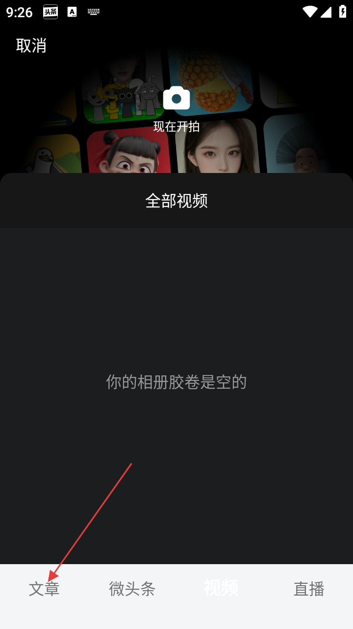 2、進入發(fā)布選擇頁面后,若要發(fā)布文章,點擊左下角【文章】選項。