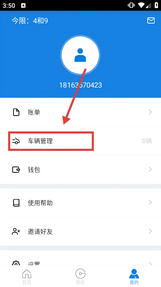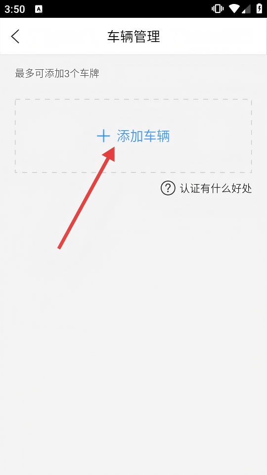3、在個人頁面,點擊【車輛管理】選項,進入車輛管理界面,可查看添加車牌的相關操作入口。