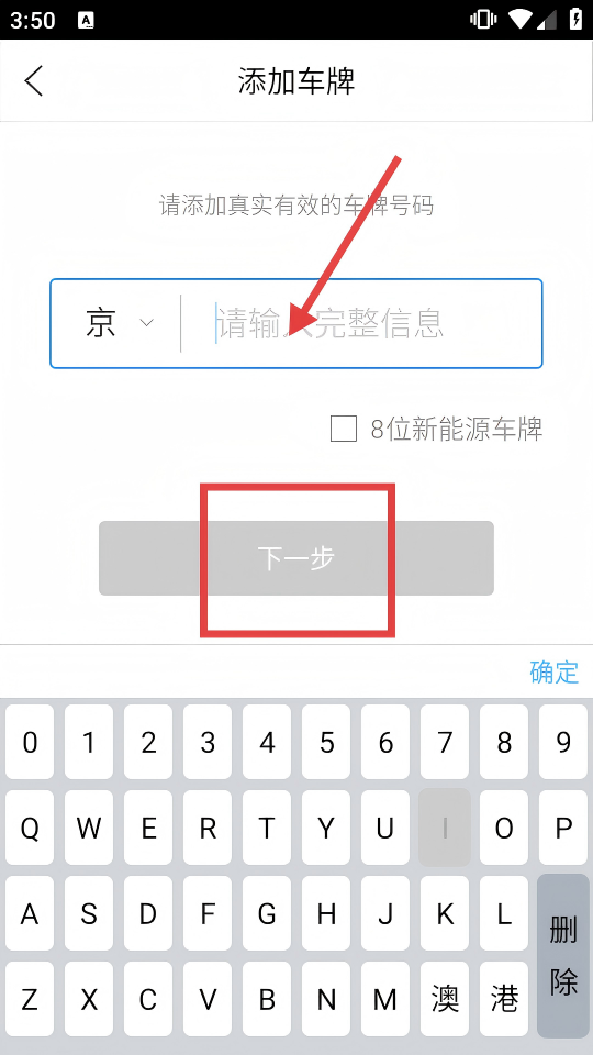 4、進入【添加車牌】頁,選擇車牌屬地(如京),輸入真實有效車牌號碼,若為新能源車牌勾選【8位新能源車牌】,點擊【下一步】。