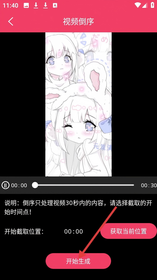 3、在【視頻倒序】頁面,點(diǎn)擊【開始生成】即可制作倒序視頻。